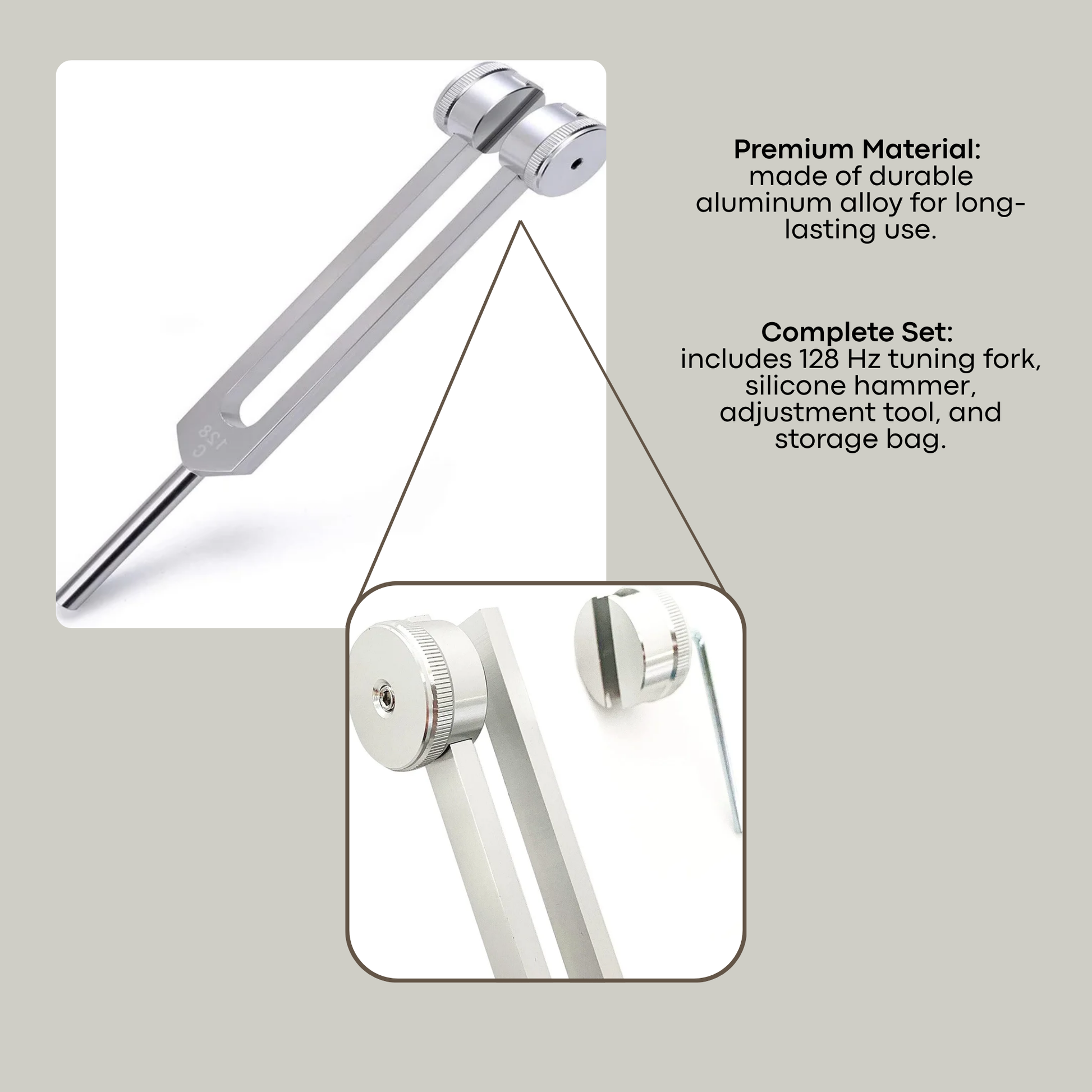 Complete Set: includes 128 Hz tuning fork, silicone hammer, adjustment tool, and storage bag.
